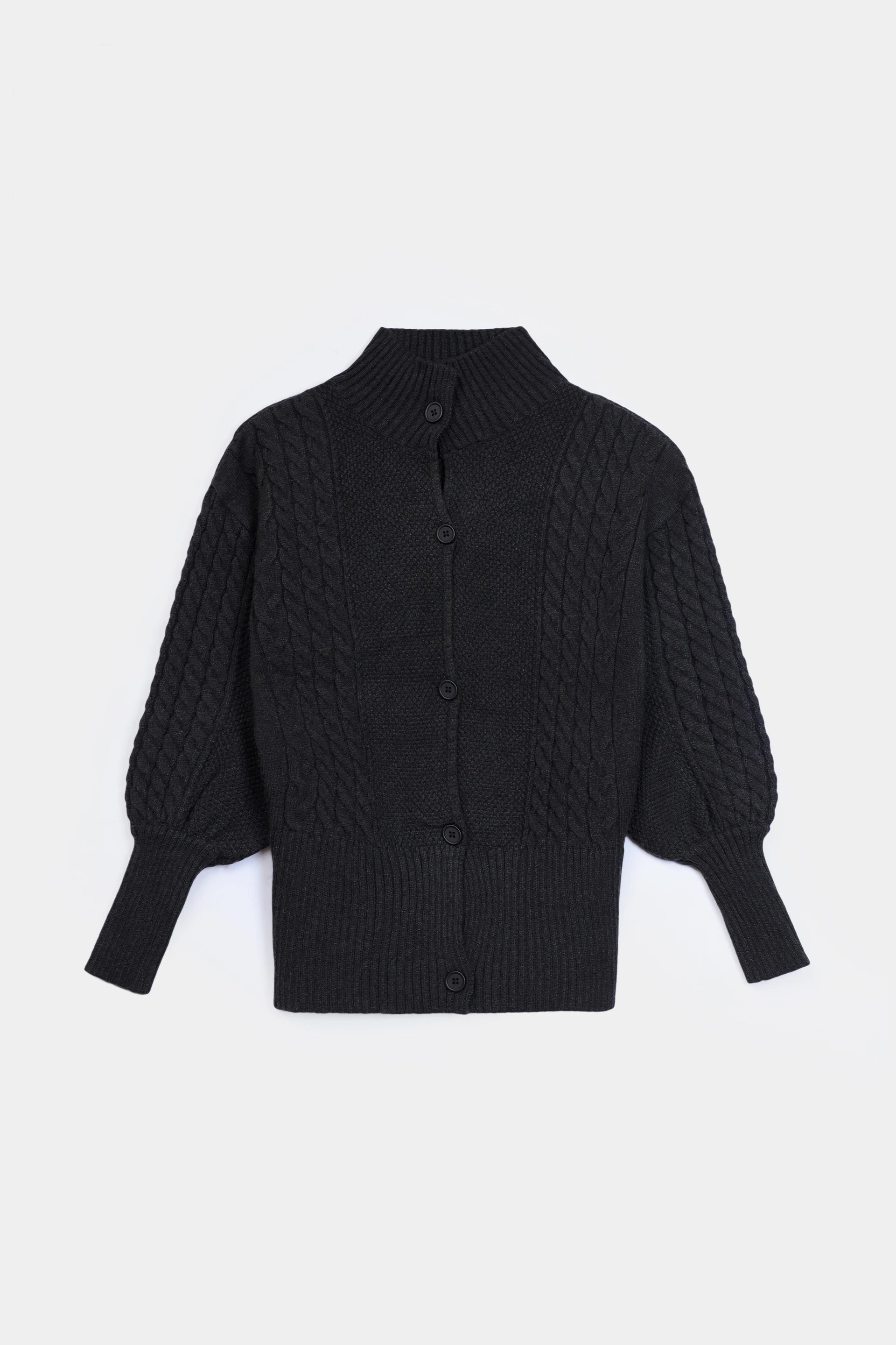 Designed with a ribbed mock neck, voluminous raglan blouson long sleeves featuring ribbed cuffs, and a ribbed hem, this cardigan's color offers a refined balance of comfort and functionality. Finished in deep green and crafted from soft fabric, it is ideal for effortless everyday wear.