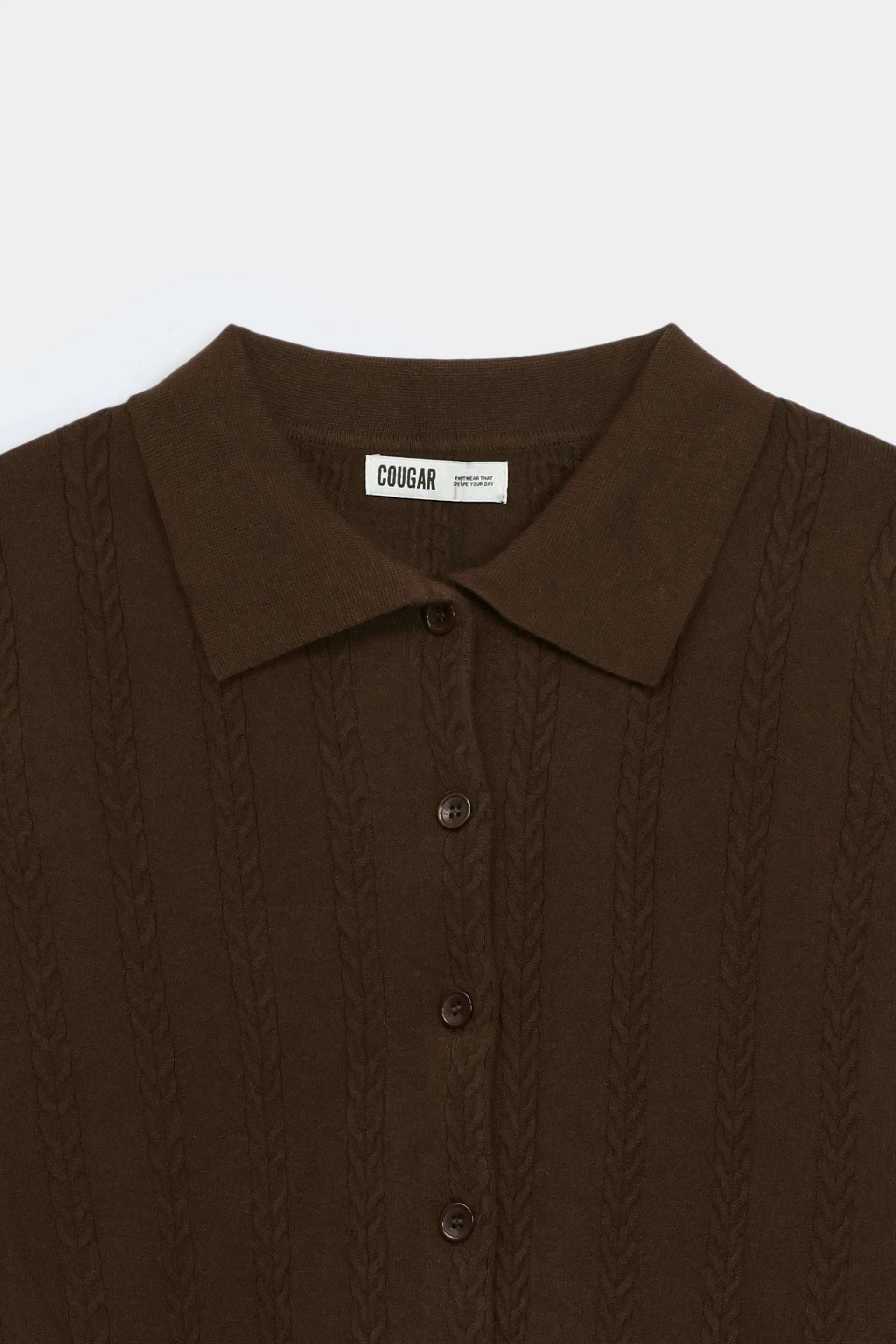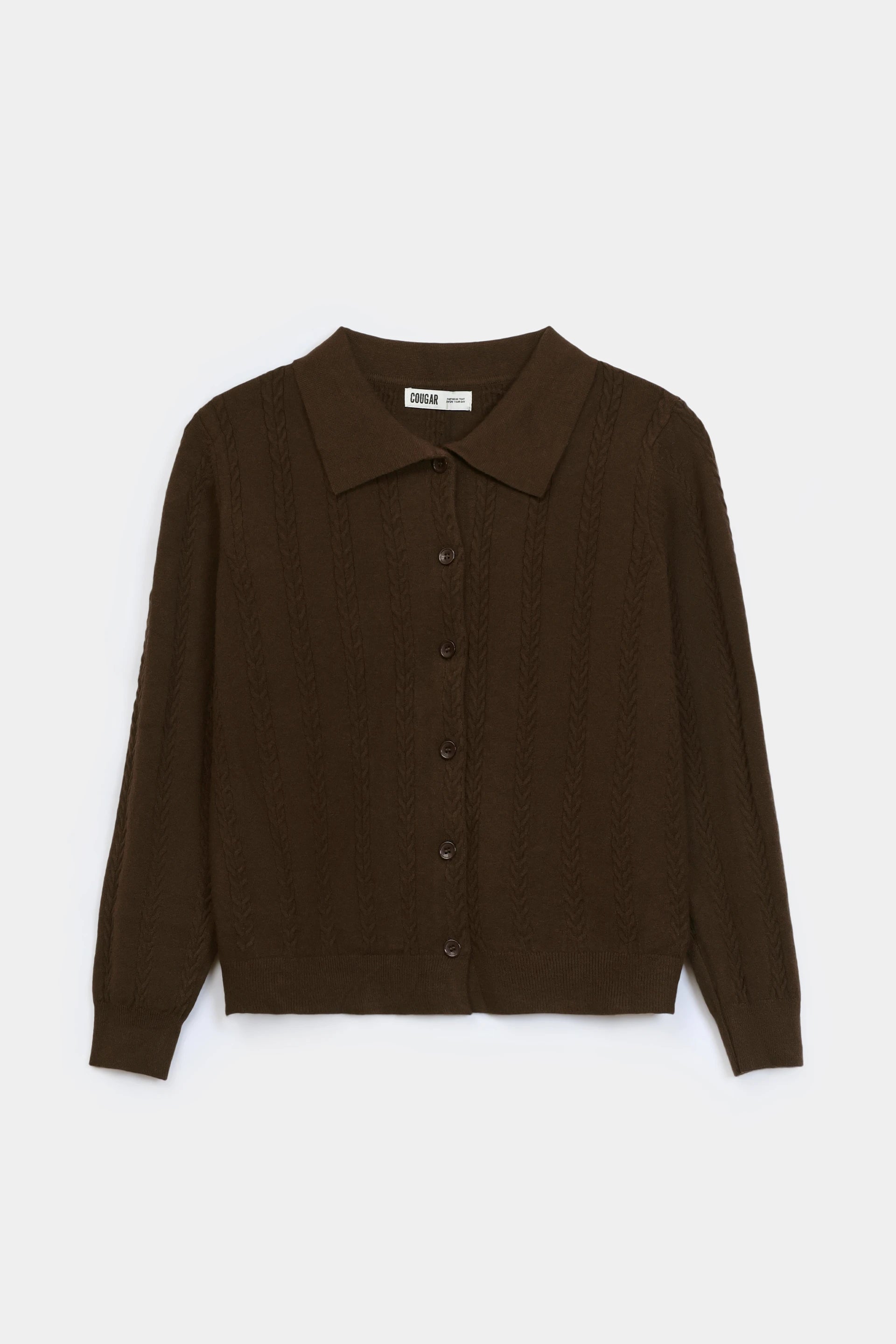 Brown cable-knit cardigan with a refined turn-down collar and front button fastening. Features ribbed trims and full sleeves for a polished silhouette. Made from a durable soft yarn blend that combines comfort with lasting wear.