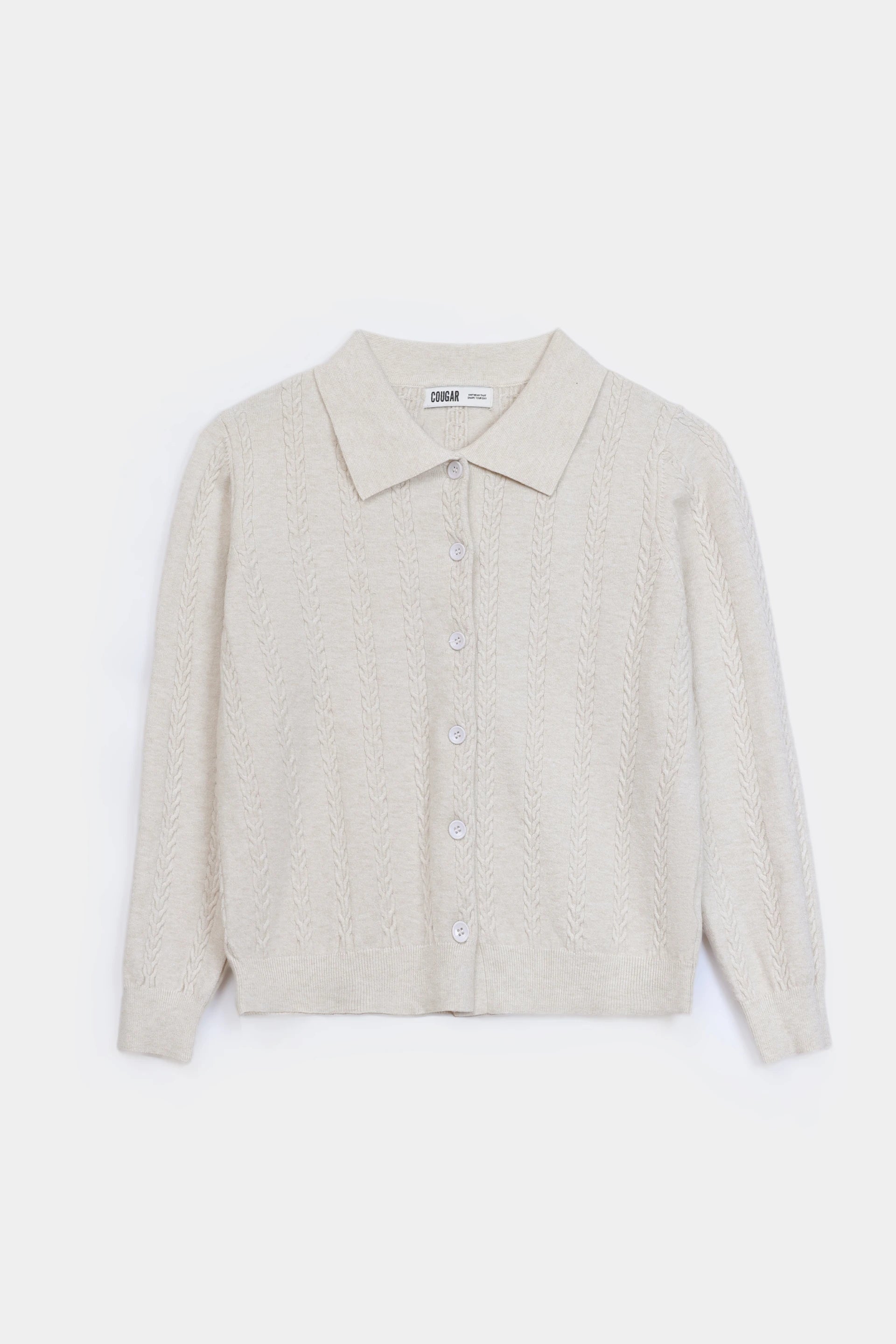 A versatile cable-knit cardigan designed with a classic turn-down collar and front button fastening. The blend of 50% PPT, 31% polyester, and 19% nylon creates a soft, durable fabric that resists pilling. Features full-length sleeves with ribbed trims for a structured finish. Avail.