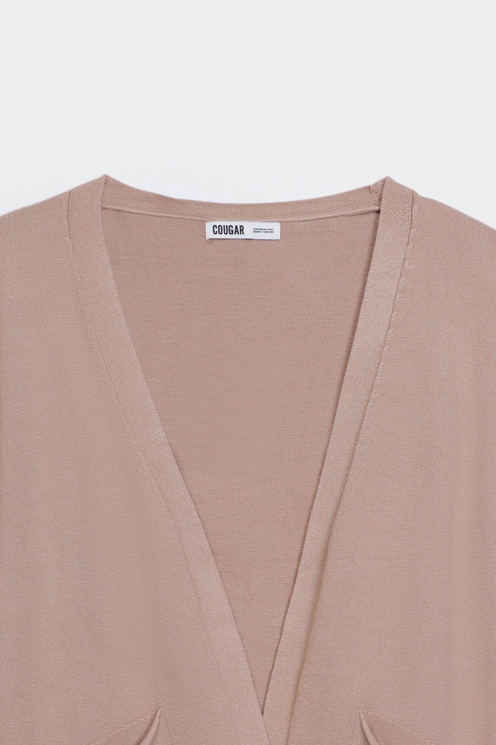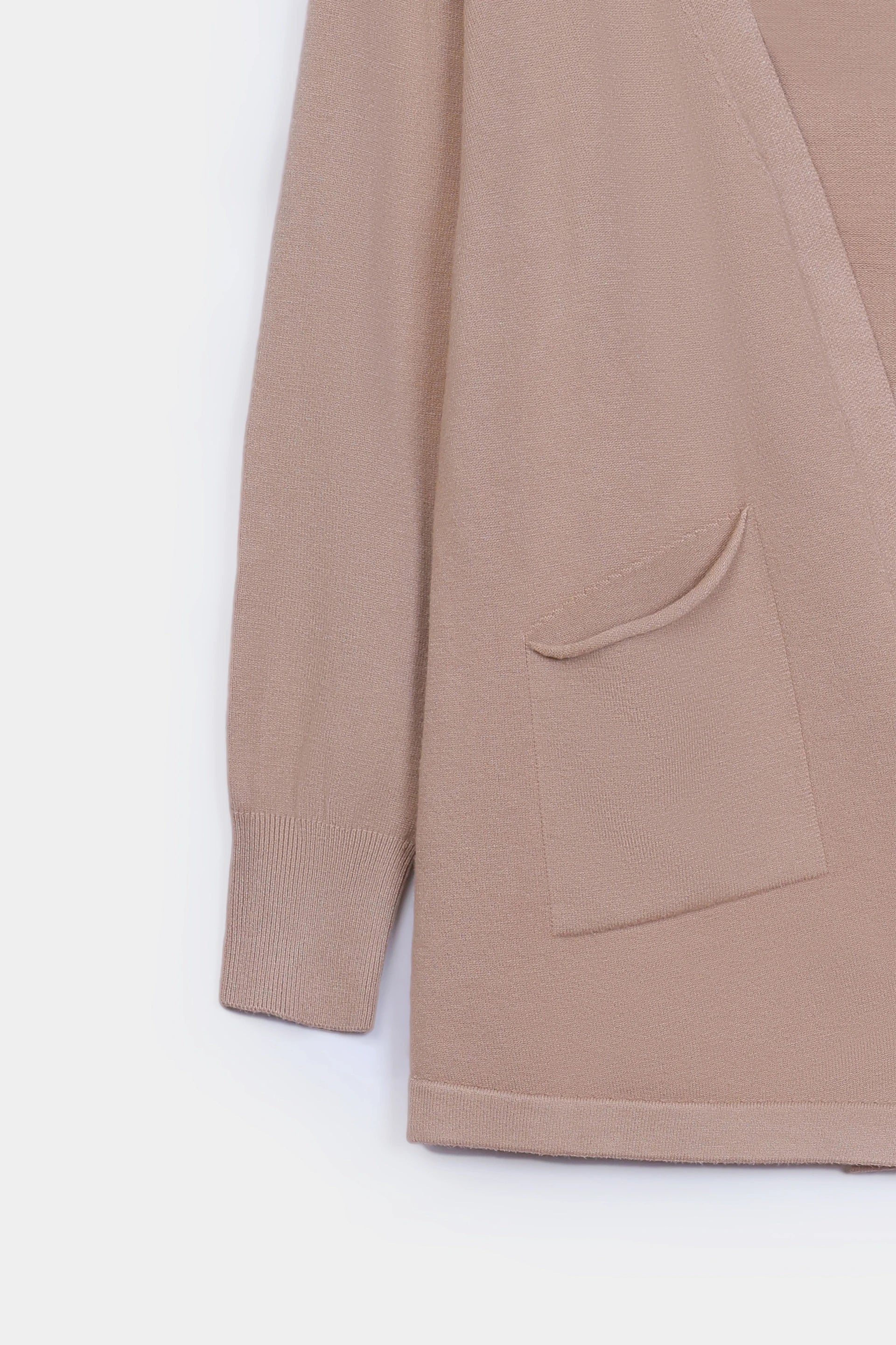 Beige cardigan with patch pockets and cuffed sleeves, crafted from a soft yarn blend for comfortable everyday wear.