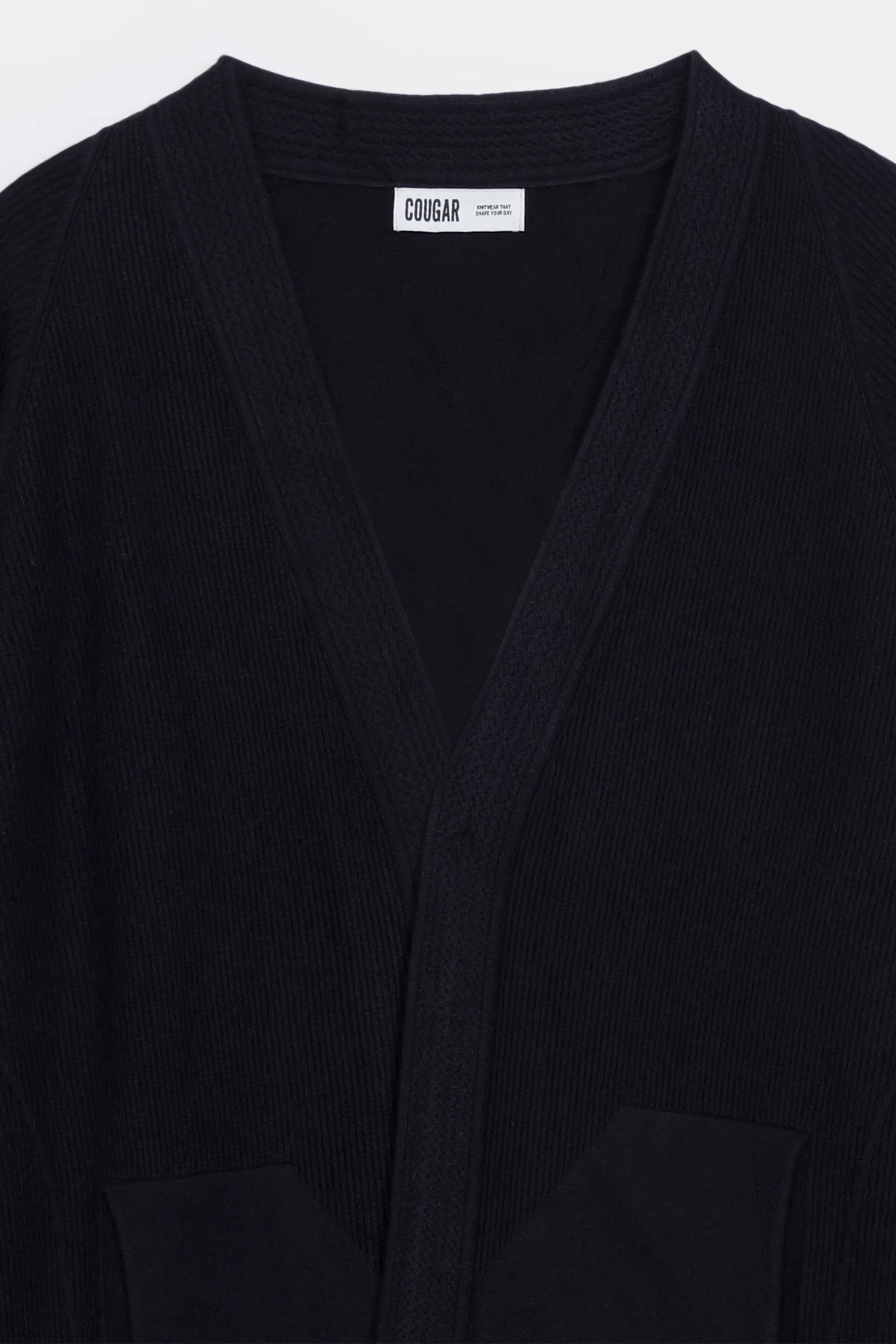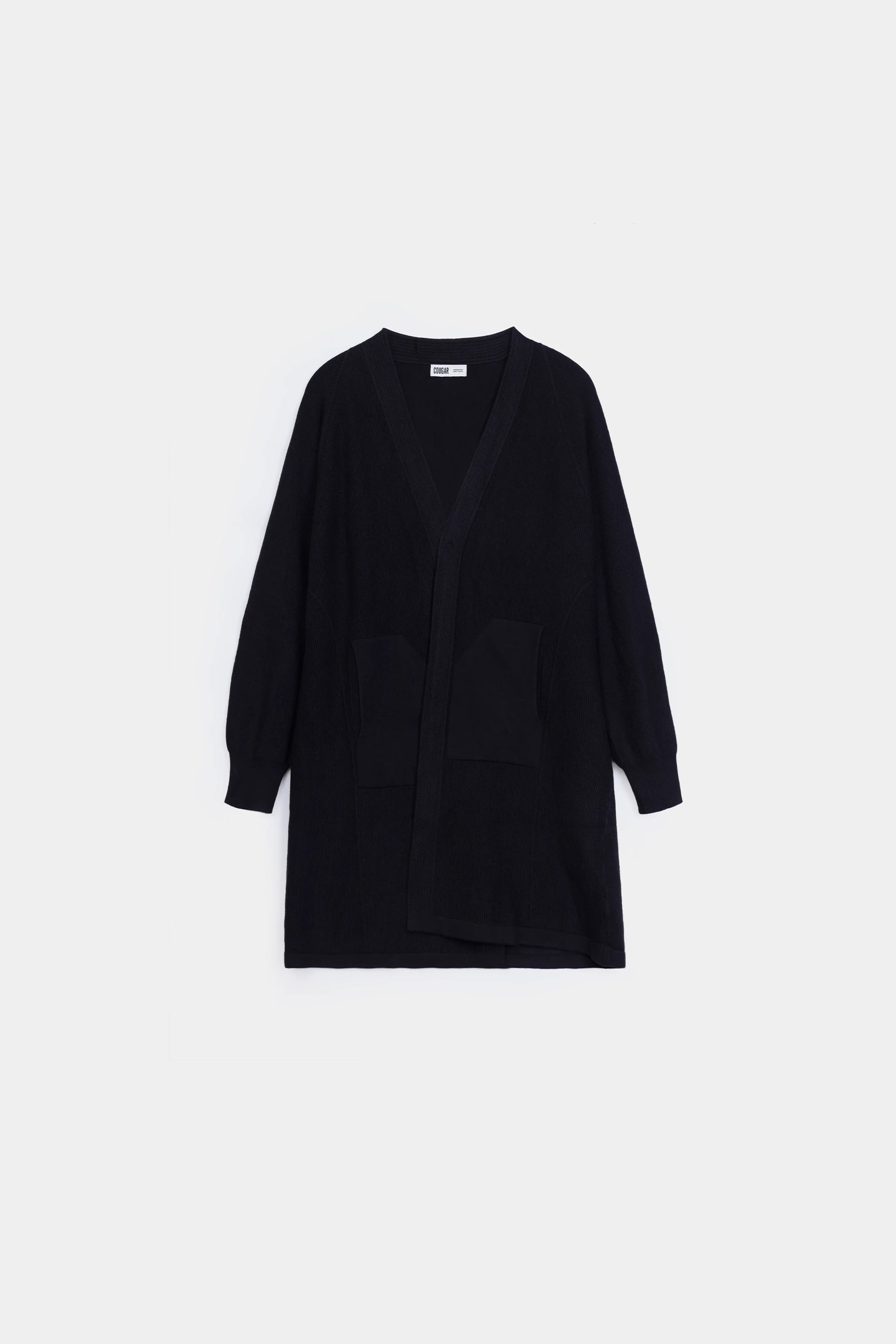 Black cardigan with soft yarn blend fabric, featuring practical patch pockets and cuffed sleeves for a refined, versatile look.