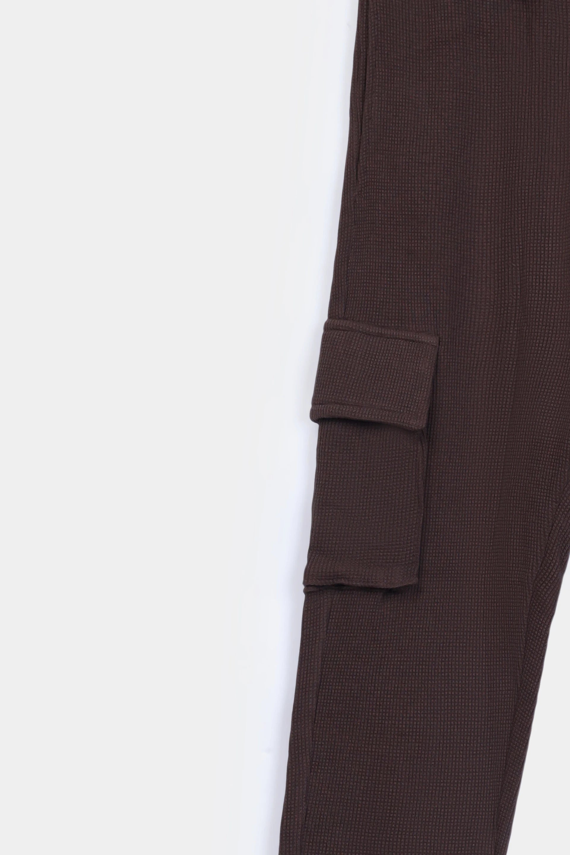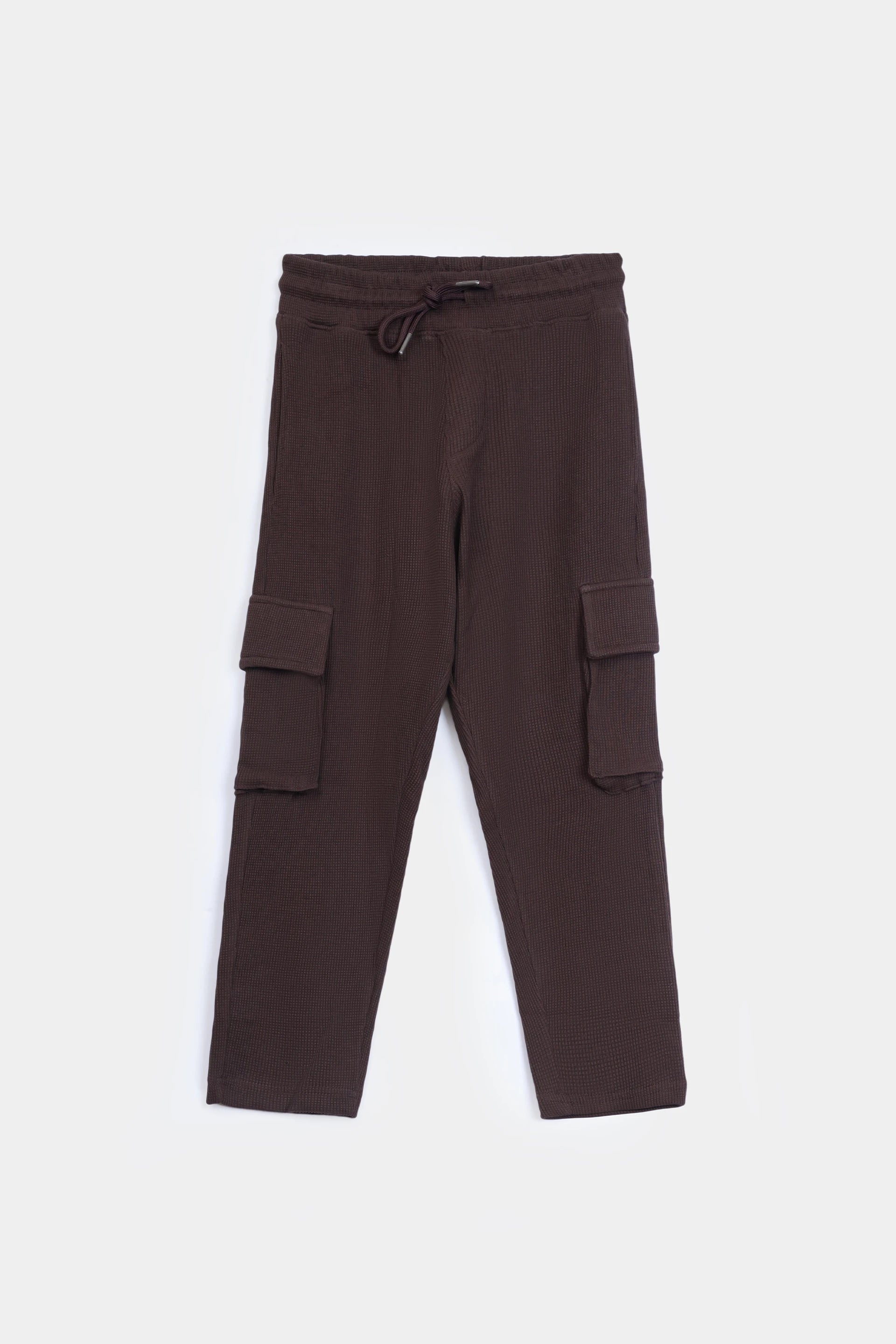 Brown waffle-knit cargo trousers crafted from 100% cotton. Features practical side and cargo pockets with adjustable drawstrings for a customized fit. The textured waffle knit fabric offers breathability and durability for everyday wear.
