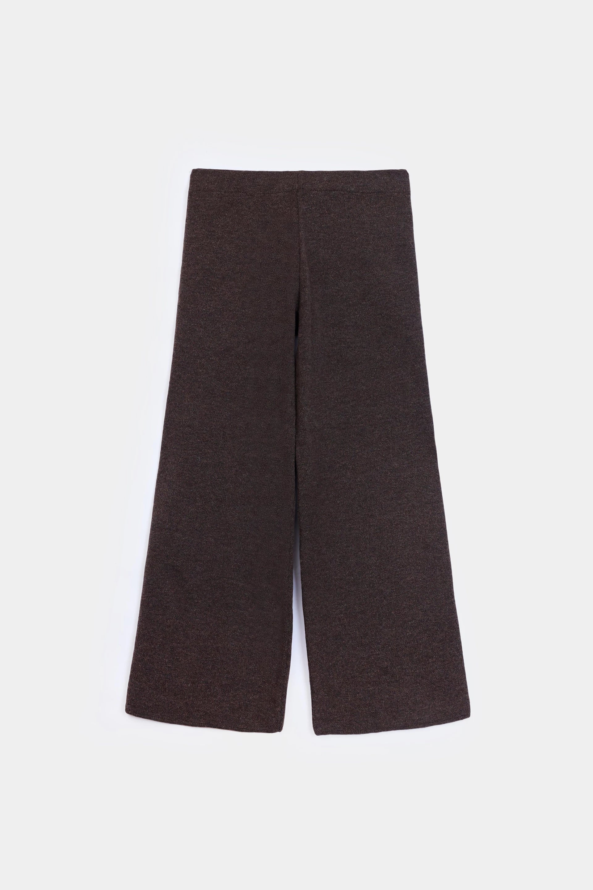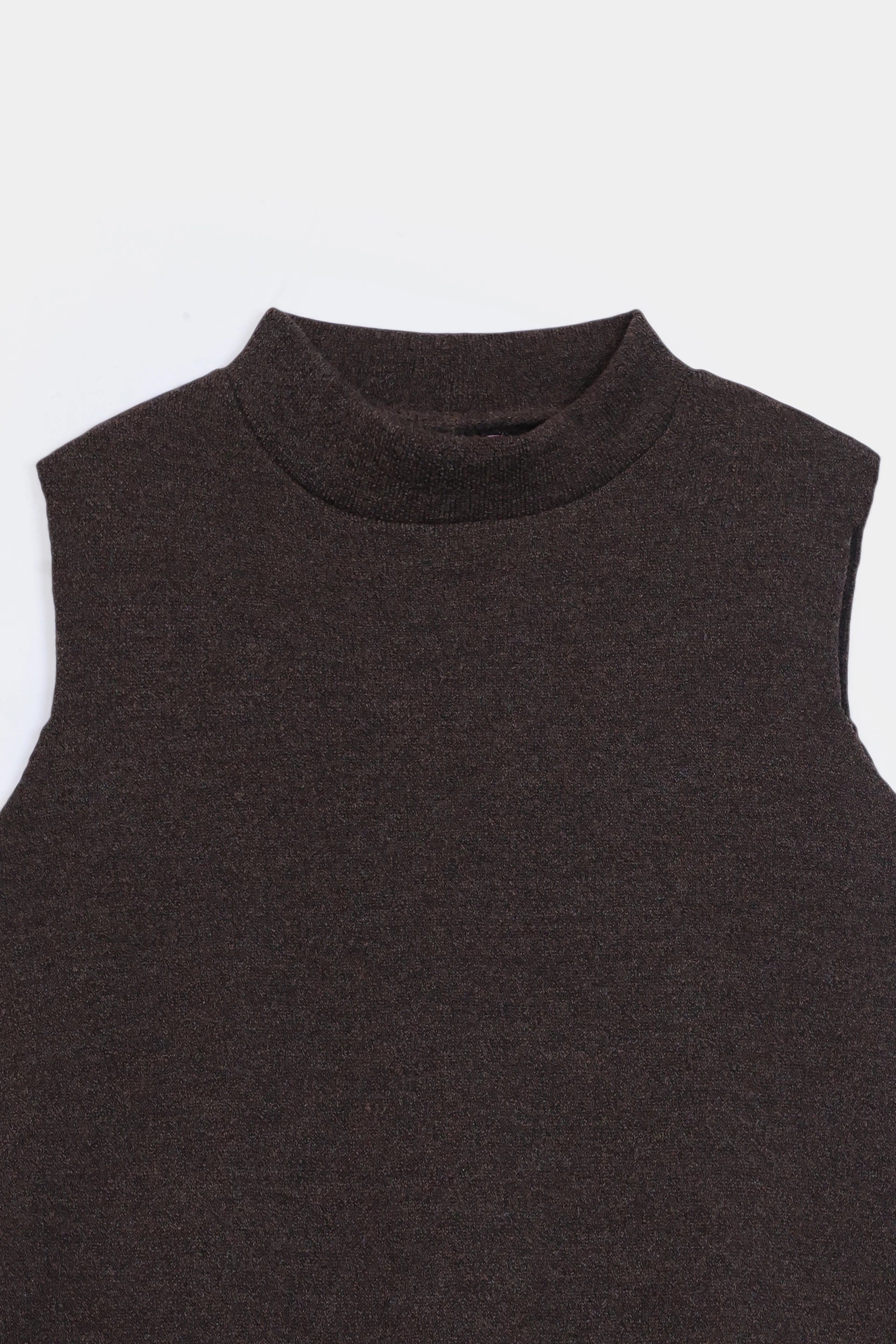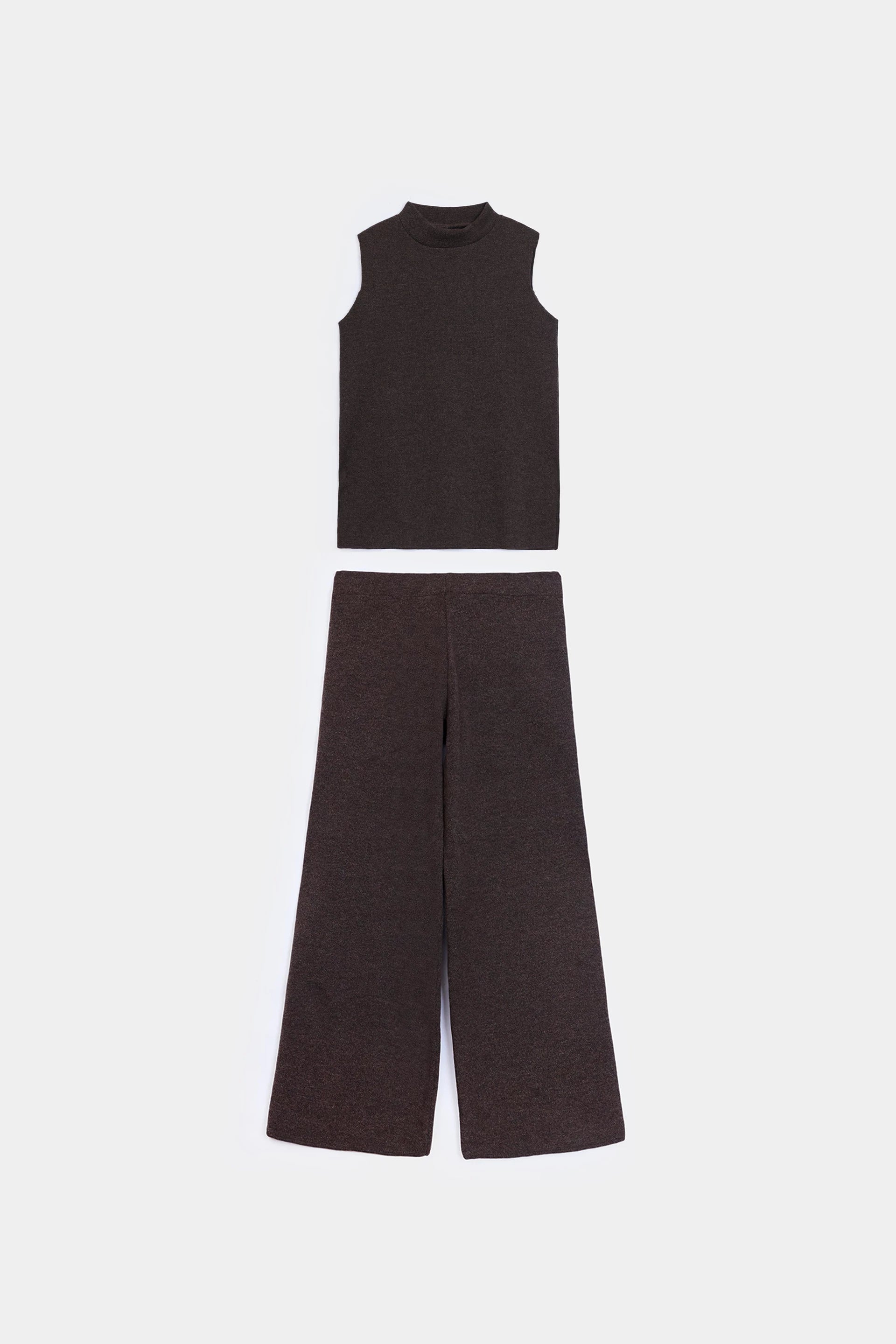 Brown wool-mix co-ord set featuring a textured mock neck sleeveless top with side slits, paired with wide-leg trousers and an elastic waist. Crafted from a 50% wool and 50% acrylic blend for warmth and durability.